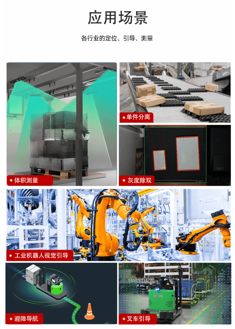 该产品结构尺寸为150mm x 50mm x 40mm,重量仅470g,小尺寸支持在静/动态体积测量、机械臂引导(eye-in-hand、eye-to-hand)、导航避障、叉车引导及机器人视觉引导等场景应用能发挥更独特的优势。
