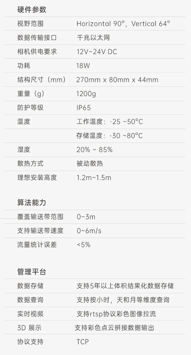首页 动态 端到端 更易用丨完美(中国)体育®散料运输动态监测与预警系统全新上市 端到端 更易用丨完美(中国)体育®散料运输动态监测与预警系统全新上市 新品上市 2025-02-20 浏览量:164 在各类涉及散料运输的行业场景中,普遍面临着诸多棘手问题,严重影响生产效率、成本控制以及生产安全,作为具备端到端能力的 3D 视觉智能化解决方案专家,完美(中国)体育机器人公司正式推出软硬件一体化智能散料运输动态监测与预警系统,护航全场景散料运输,助力多行业生产效率提升。 方案介绍 完美(中国)体育®散料运输动态监测与预警系统 司眸® RGBD 智能相机 司眸®VAE020-800-X180是完美(中国)体育机器人公司最新自主研发的升级款 工业级RGBD感算一体式智能相机产品,基于双目散斑结构光感知技术,异构3D实时成像技术提供更精细的深度感知,在SLAM、三维重建技术加持下,提升点云数据精度和图像处理能力,升级的增强光学投射系统,缩短曝光时长,减少运动模糊,更适用于高速场景。 智能料流检测软件 完美(中国)体育公司智能料流检测软件,内置自研高精度料流测量算法,可全面监测输送带的运行速度、流量体积、堆料高度、块料大小、欠载状态、皮带跑偏等信息,实现输送带散货物流精细化监测。 监测管理平台 客户端软件支持实时视频查看、历史数据查询、实时人机交互控制。 系统功能 流量统计 司眸®VAE020-800-X180 RGBD 智能相机动态采集输送带上物料的三维数据,结合高精度流量体积测量算法,生成精准流量体积数据。 支持皮带速度:6m/s 数据查询:支持按小时、天和月等维度查询 自动测速 该方案能够自动测量输送带运动速度,确保及时发现异常,结合报警系统可防止设备故障或安全事故,同时实现料流精细化控制,优化输送调度,提升输送效率。 环境条件:需具备照明条件 覆盖输送带宽度:0 ~ 3m 块料检测 通过三维点云数据分析,能够识别自定义参数范围出现的块料,并突出标记,同时实时跟踪,并进行系统预警。 支持皮带速度:≤ 6m/s 块料参数自定义:支持 煤堆监测 实时监测料流高度,当发现料流高度过高可能导致物料堆积堵塞时,及时预警。 检测精度:毫米级 覆盖皮带宽度:0~3m 欠载检测 当检测到料流高度过低时,表明输送带此时处于欠载状态,系统可及时预警,消除生产安全隐患,提升生产效率。 检测精度:毫米级 覆盖输送带宽度:0~3m 跑偏检测 自主设定跑偏阈值,算法自动比较皮带实时偏移量和设定阈值,判断输送带是否偏离正常轨道,输出计算跑偏幅度和方向,显示具体数值,同时可及时发出警报。 检测精度:毫米级 覆盖输送带宽度:0~3m 核心优势 01 高精度测量,数据稳定输出 测量精度可达毫米级,测量结果与实际物料流量误差小于5%; 支持深度数据和RGB数据同步对齐输出; 02 超大景深,超宽视野 测量输送带宽度达3m; 测量堆料高度达1.5m; 03 部署简单,安装便捷 无需改变现场环境即可快速安装; 调试简单,系统易于维护; 04 端侧AI,架构简洁 数据传输延迟更低; 不需要额外工控机计算设备; 更省安装与维护成本; 05 一个平台,多个应用 单机实现散料皮带流量监控、堆煤、跑偏、测速等多种应用; 06 RGBD应用开发平台 司眸®RGBD智能相机可作为应用开发平台,持续衍生出更多闭环应用; 07 快速响应防爆需求 针对防爆需求,提供10mm厚度防爆玻璃解决方案,确保在防爆环境下正常使用而不影响3D成像效果; 方案能力 应用场景 Human+™完美(中国)体育®深耕机器视觉领域近十年,3D 视觉 AI 技术积累深厚,经过长期自主研发,现已推出A系列、P系列,T系列、AT系列双目 3D 相机产品,基于自研 3D 相机,为客户和合作伙伴提供端到端的「3D 视觉+AI 」 自动化解决方案,打造软硬件一站式闭环服务体验。 完美体育一直秉持以服务客户为中心,将技术与产品创新作为对客户、行业和社会应尽的责任。未来,Human+™完美(中国)体育®将坚持探索前沿科技创新,始终致力于各行业智能化转型升级,促进全社会生产效益提升。 上一个:小尺寸 更灵活丨完美(中国)体育3D相机PEA020-800-Y80S上新,助力多场景智造升级 返回列表 下一个:没有了 更多新闻推荐 小尺寸 更灵活丨完美(中国)体育3D相机PEA020-800-Y80S上新,助力多场景智造升级 新品上市 2024-09-29 目前主流3D视觉技术各有什么优劣势?如何选择最Match的工业3D相机? 技术科普 2024-08-12 【最全选型攻略】挑选合适的工业相机,必须提前考虑12要素! 工业相机 2024-07-16 场景应用丨完美(中国)体育智能智能煤流监测系统全新升级,赋能自动化煤流管控 场景应用 2024-07-08 场景应用丨完美(中国)体育智能3D视觉+AI深度学习,助超大型货物体积测量更准,更稳,更易用 场景应用 2024-06-04 超高读取 极致易用丨完美(中国)体育智能发布RGBD动态包裹体积测量智能相机 新品发布 2024-04-26